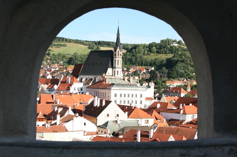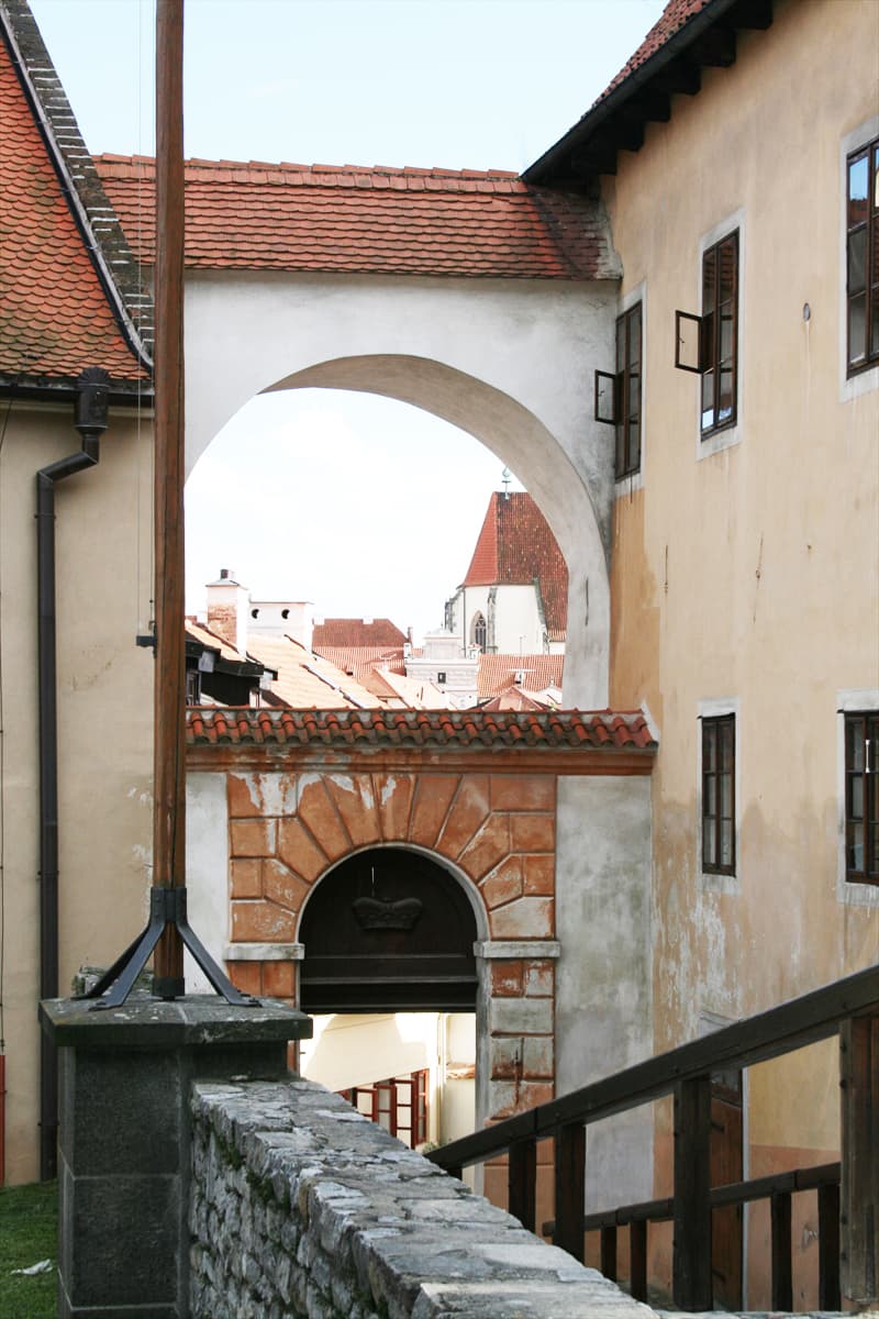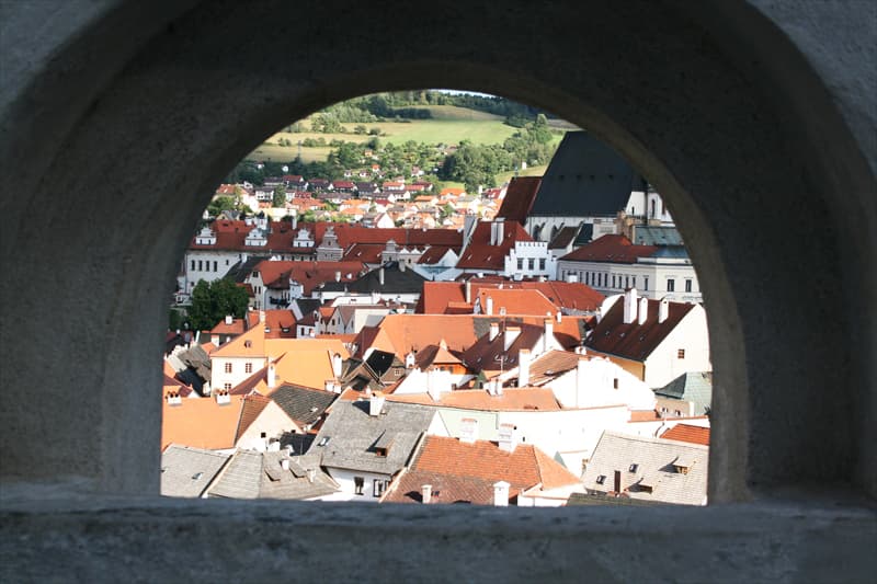 まず一つ目のポイントはチェスキークルムロフ城の4番目と5番目の庭をつなぎますプラシユーティ橋からの旧市街の眺めです。