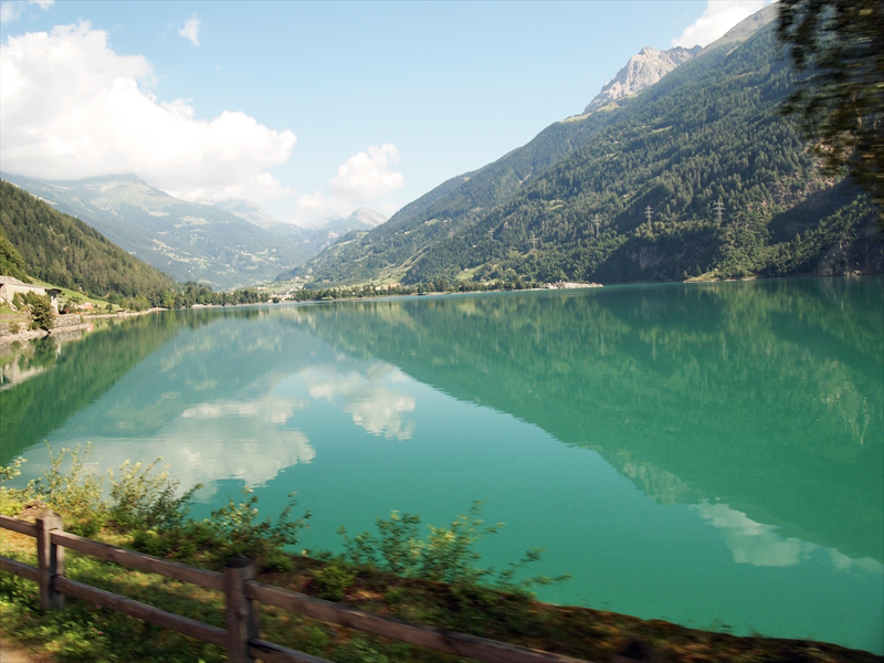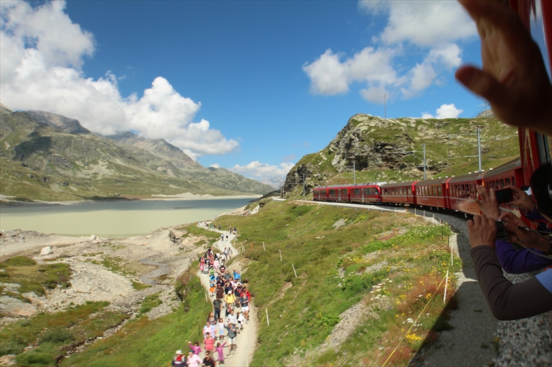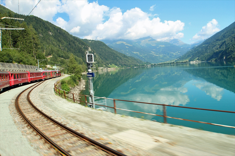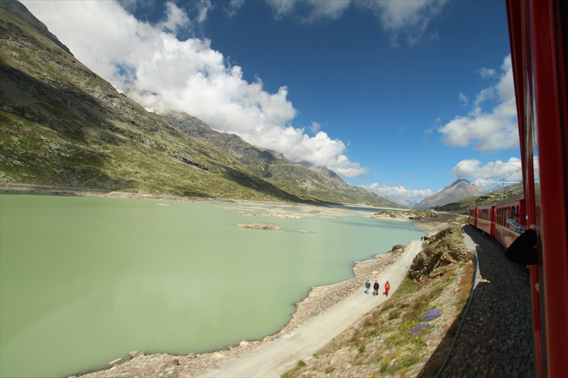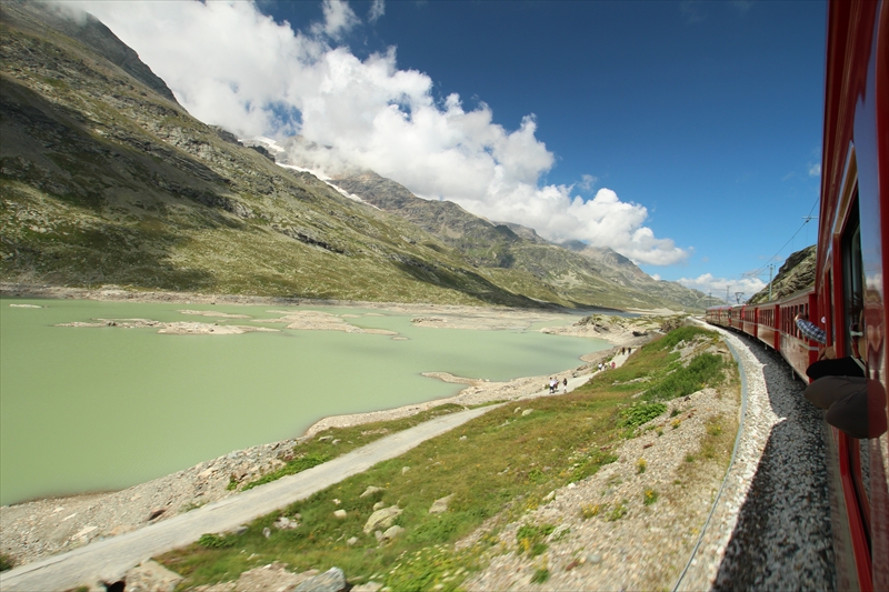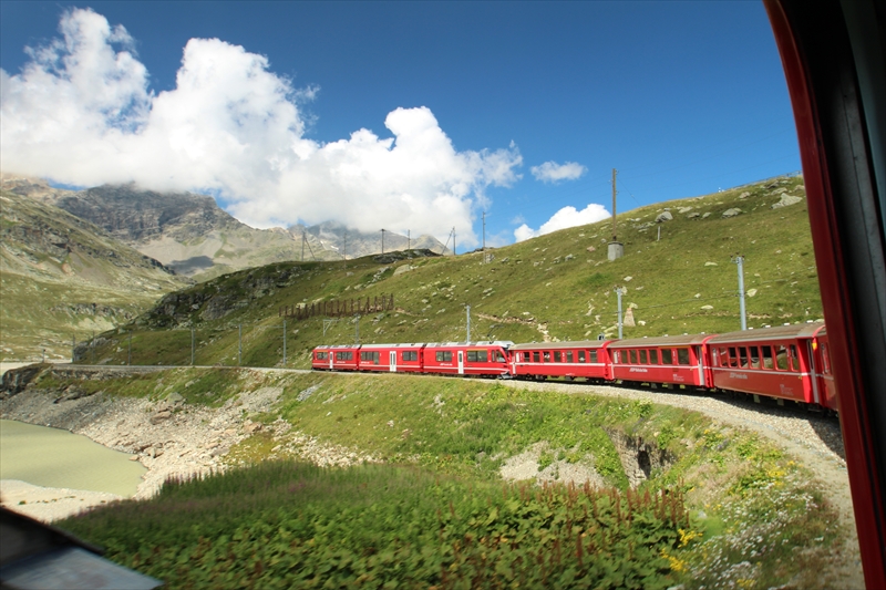 ベルニナ線の列車は風光明媚な湖のほとりを通過したりして、次第に高度を上げていきます。