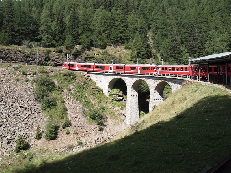 ・ベルニナ線きっての名所で、列車が ぐるっと一周しながら高度を調整する 石造りのループ橋