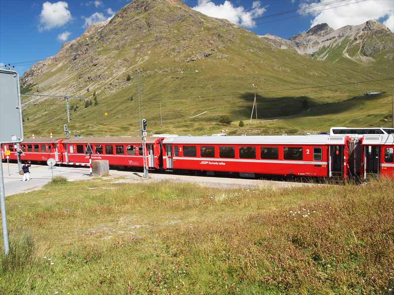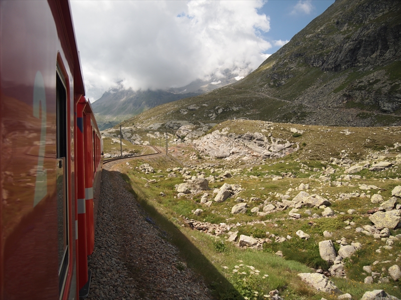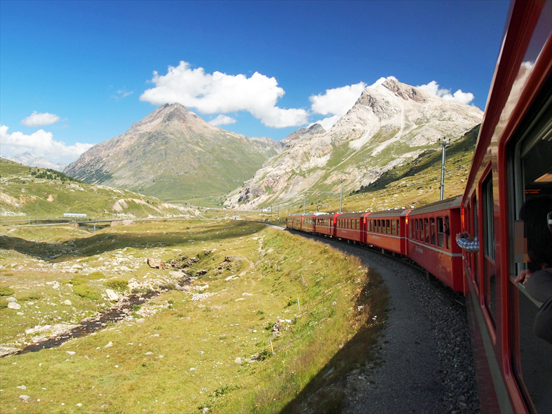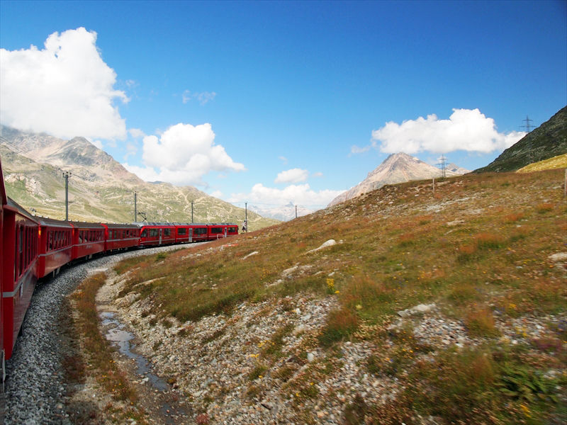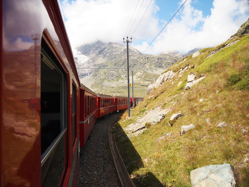 ベルニナ線は標高約429 mのティラノ駅から標高2253 mのベルニナ峠まで登りながら、標高差約1800 m を走る「世界で最も高い粘着式鉄道」 で、途中の景観が圧巻で列車の旅そのものがすばらしいのです。