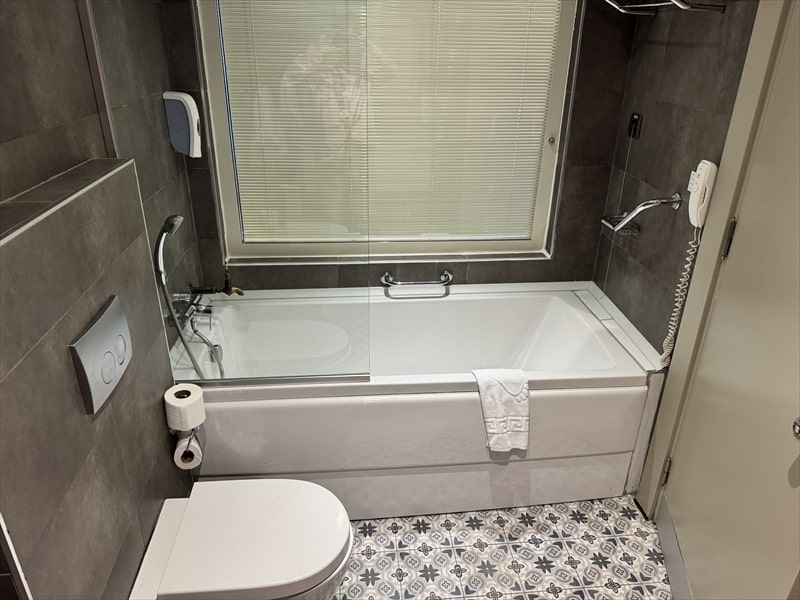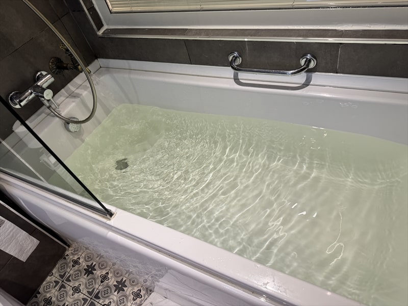 洗面所やバスタブのお湯の出る量が少ないので苦労しましたが、午後10時から11時までの1時間だけ温泉が出る蛇口があって、部屋のバスタブで温泉が楽しめたのはとても良いと思いました。