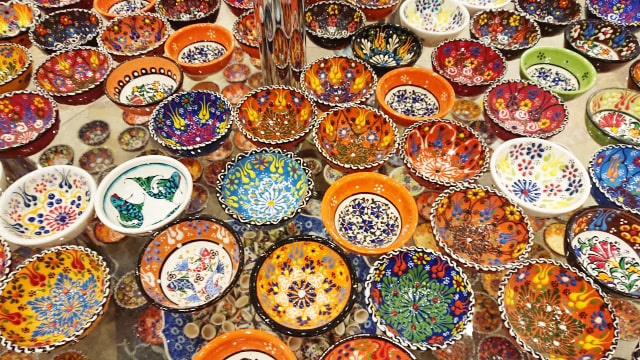 伝統的なトルコのモチーフが描かれた色とりどりの陶器はトルコのお土産品として人気です。