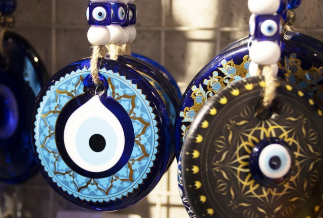青い目玉の魔除けのお守りナザールボンジュウは嫉妬や恨み、邪視から守ってくれるというトルコの土産で、インテリアやアクセサリーとしても人気です。