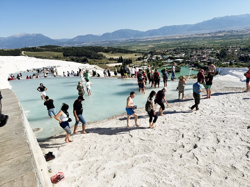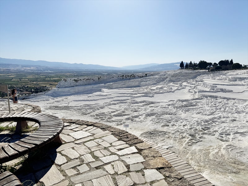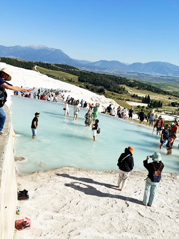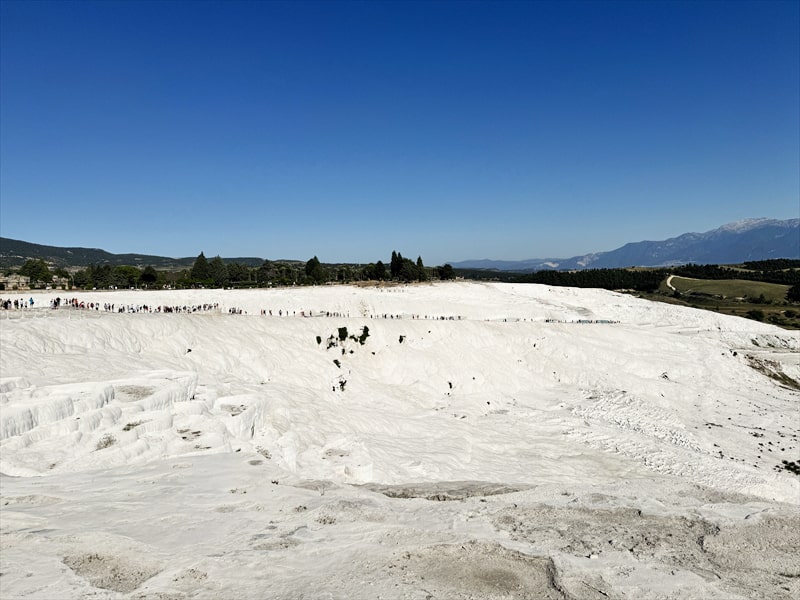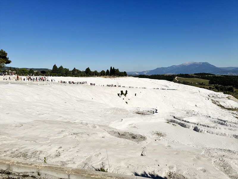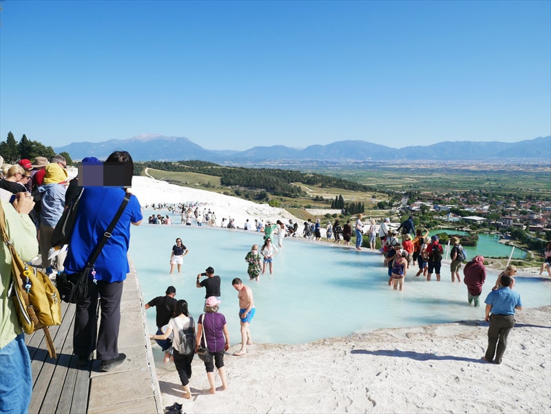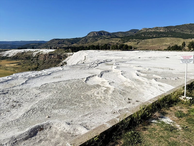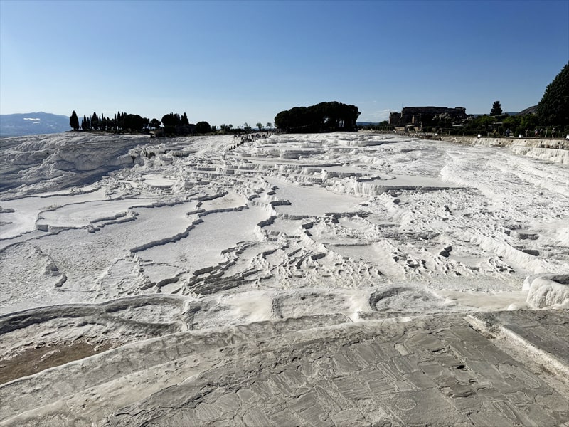 鍾乳石でできたまっ白な台地が棚状に広がっていて、そこに湧き出た温泉が流れている場所が広がっているというイメージだったのがパムッカレだったのですが、実は湧き出る温泉の量がかなり減ってしまったので、実際には温泉が流れている所は管理されていて一部の所しか流れていません。