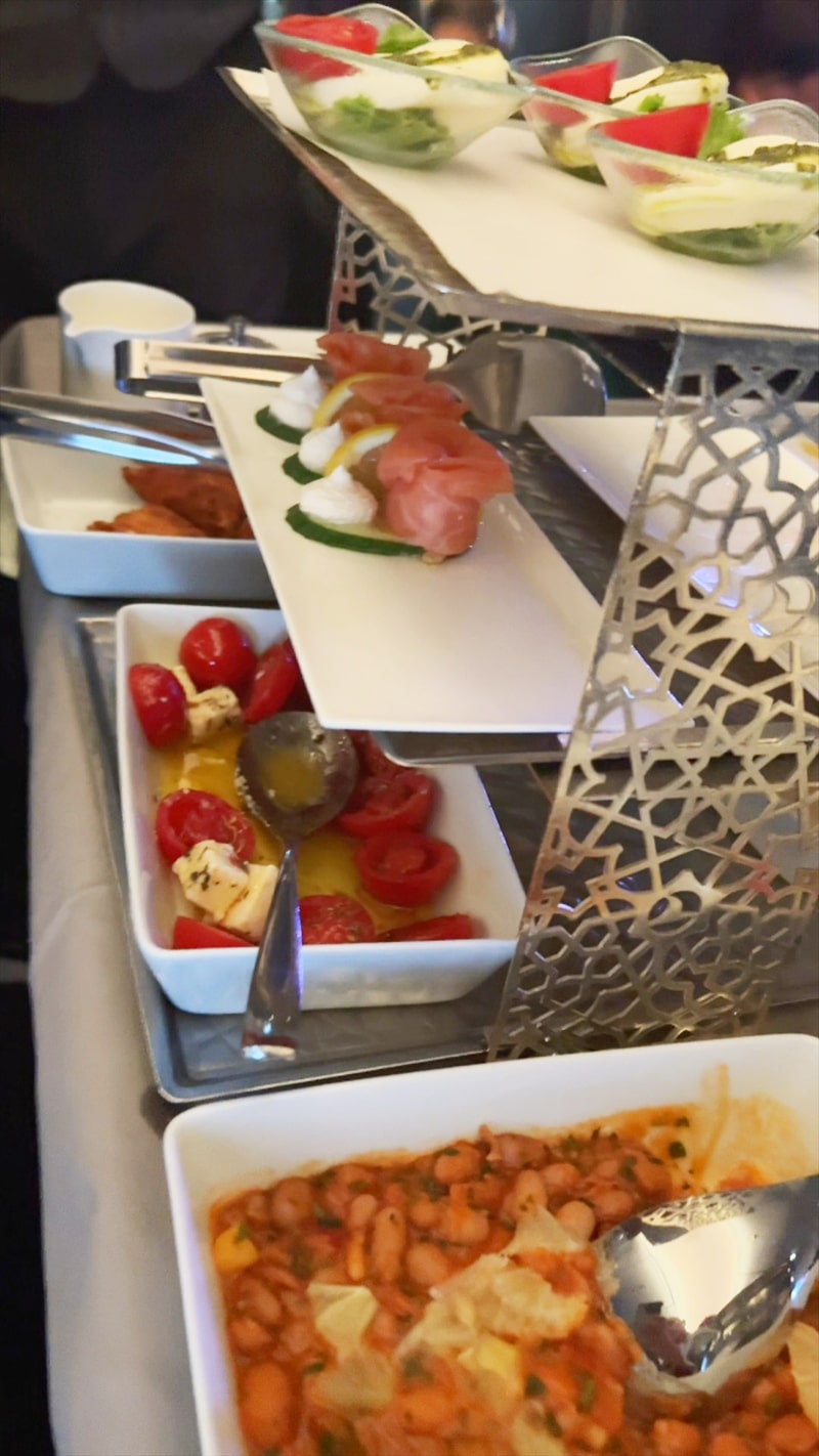 ターキッシュエアラインではコックコートに身を包んだフライングシェフが居てワゴンサービスで前菜を盛り付けてくれるとPRされていましたので期待していたのだが、フライングシェフは1名しかいないので私たちのサイドではキャビンクルー2名がワゴンを押してサーブしていました。