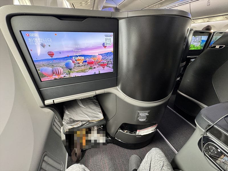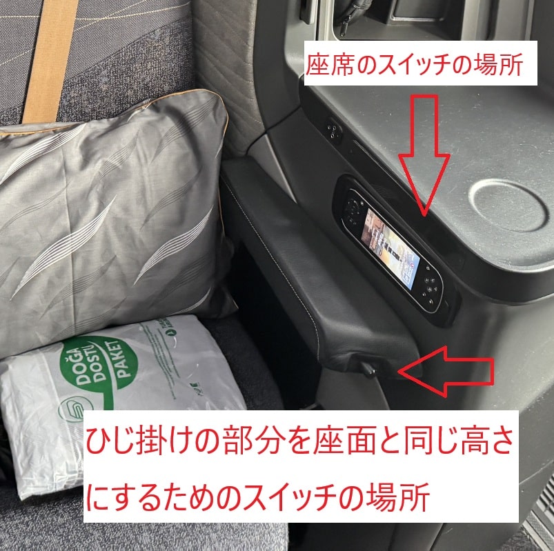 同行者はひじ掛けが下がるのを知らなかったので寝ている時にターキッシュエアラインのビジネスクラスのシートは寝る時には狭いと言っていましたので教えてあげました。