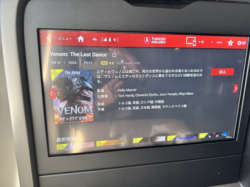 映画は往復の機内で4本見ましたが、最新作の中には日本語吹き替えで無いものや、日本語字幕すら無いものがありましたので他の人気航空会社よりも少ないと感じました。