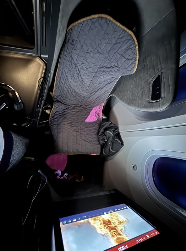 ビジネスクラスのシート幅や長さは標準的だと思いましたし、足元の部分にも嫌な出っ張りなどもありませんでしたので快適にフラットにして寝ることができました。