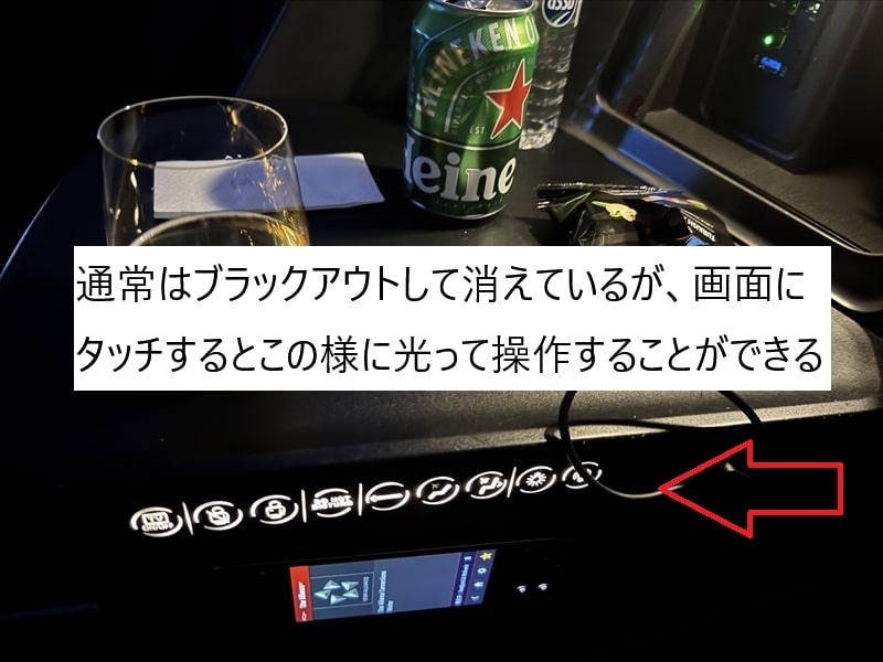 座席に座った時にシートを倒すスイッチの場所が分からなかったのですが、スイッチのある場所が通常はブラックアウトされていて、画面にタッチすると表示が出てくるものとなっていました。