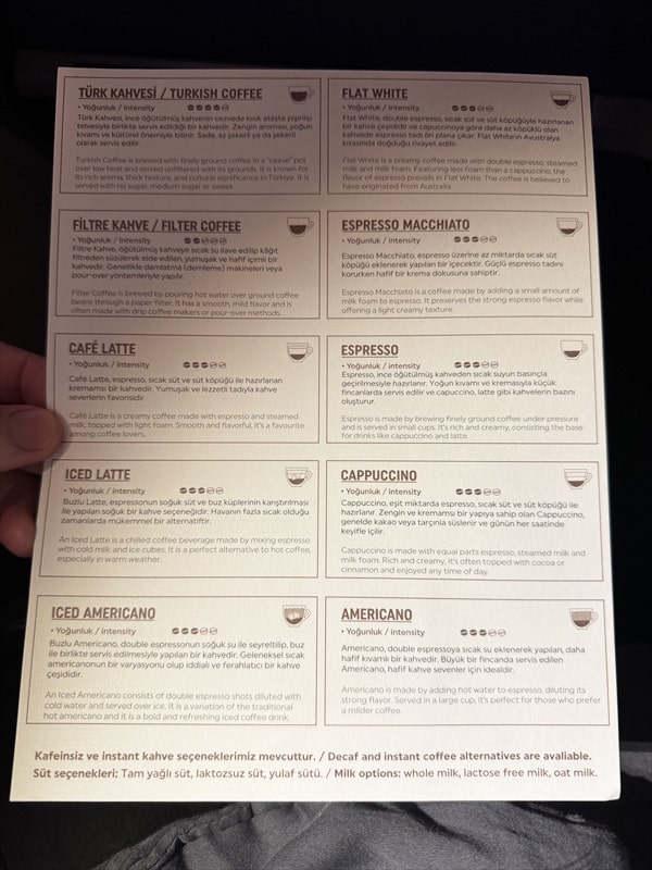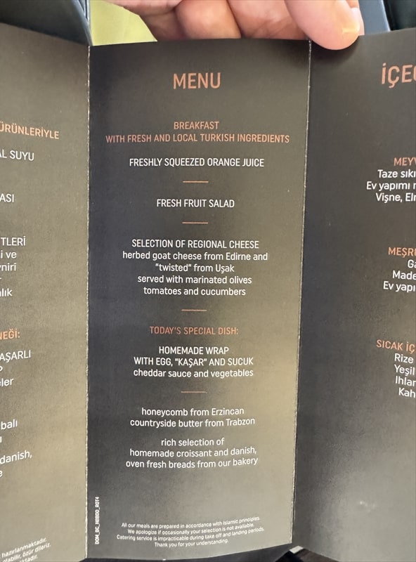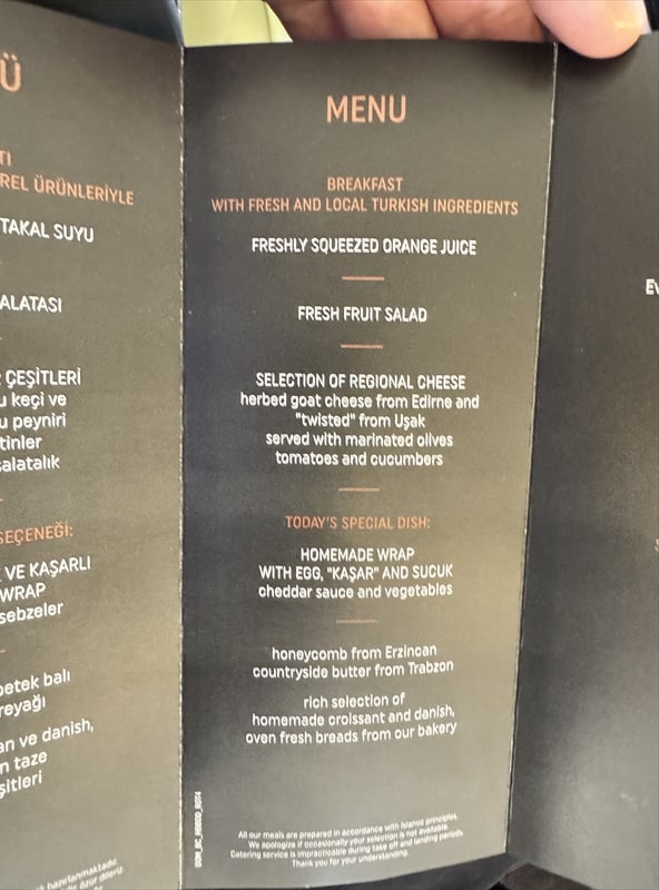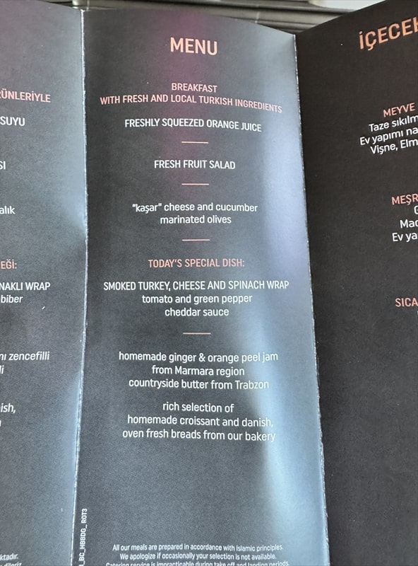 食事のメニューは日本語のものがあるという記事の方もいましたが、残念ながら今回は英語とトルコ語のものが配られました。