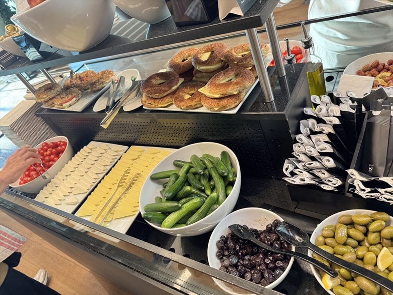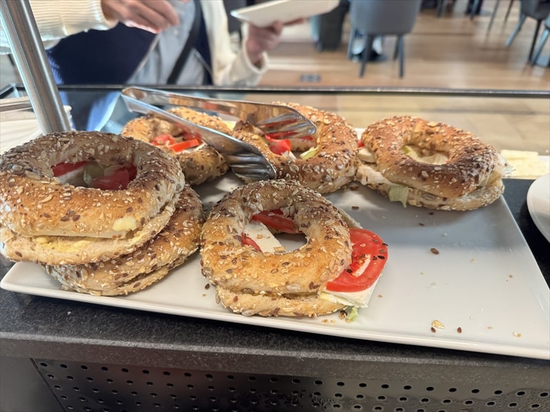 国際線に比べますと質素ですが、サンドイッチ、サラダ、チーズ、パン各種とドリンクが置かれています。
