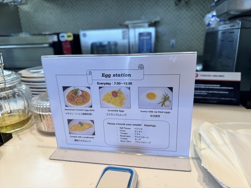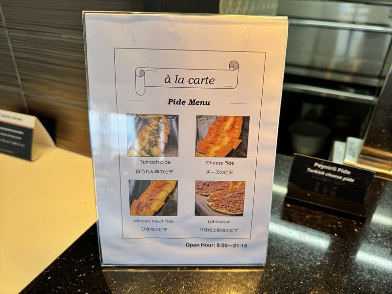 まずはラウンジの目玉として焼き立てのトルコ風のピザの「ピデ」を食べることができるとのことでしたのでとても楽しみにしていたのですが、ピザの提供は午前9時からの提供となっていたので、スタッフに今はまだ早い時間なので食べることができないと言われました。