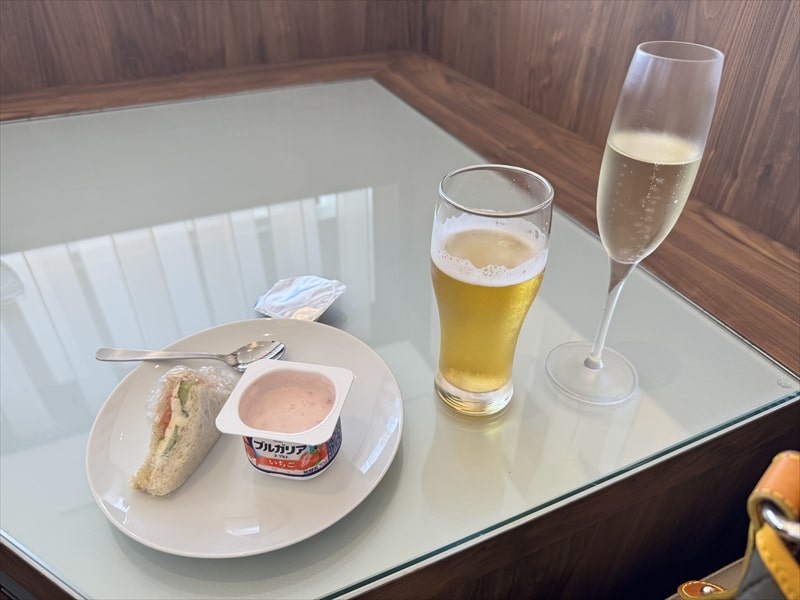 機内食も搭乗後にありますので、とりあえずはサンドイッチとヨーグルト、サラダとシャンパンとビールの朝食を頂きました。