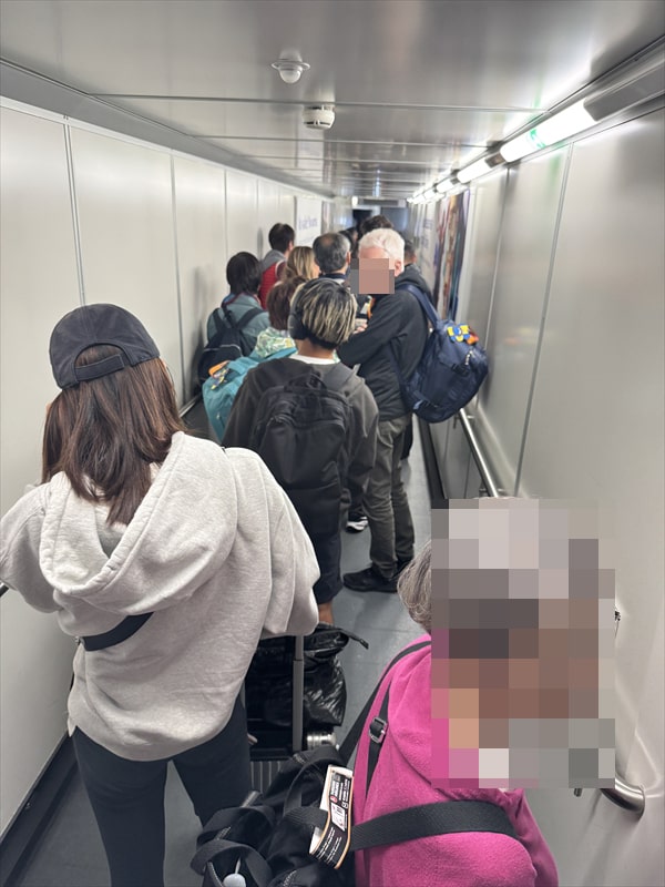 そして搭乗口で待っていますとビジネスクラスの搭乗開始の案内がありましたのでゲートを通過したのですが、なぜかボーディングブリッジで機内に入るのに10分も待たされました。