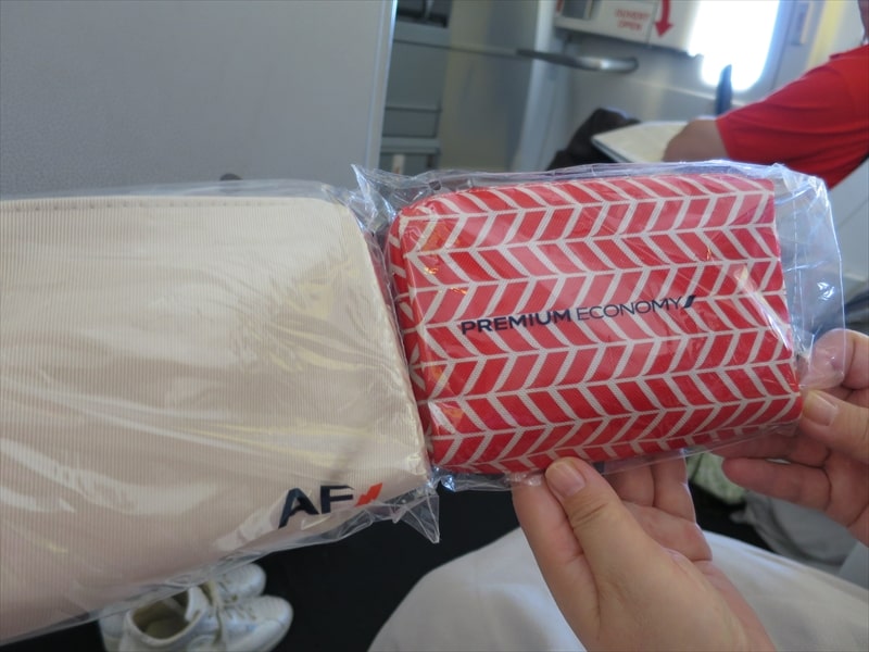 プレミアムエコノミークラスの席では機内での滞在が快適になるための、エコノミークラスよりも良いアメニティが配られます。