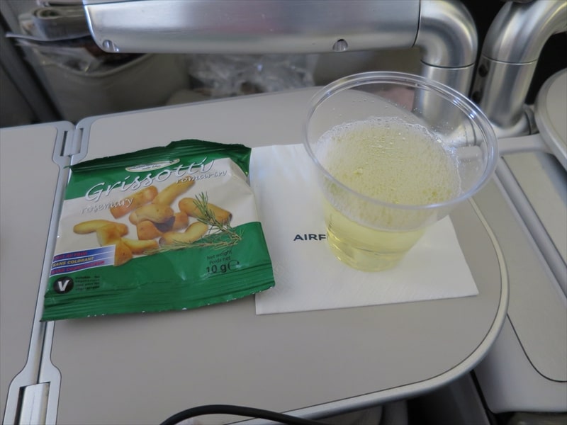エールフランスが良いのはエコノミークラスであっても、最初のドリンクサービスでシャンパンが飲めることです。