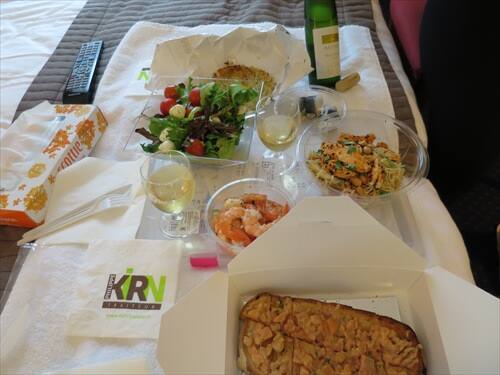 メゾンルージュの部屋は広くないことからベッドの上に料理をのせて食べました。
