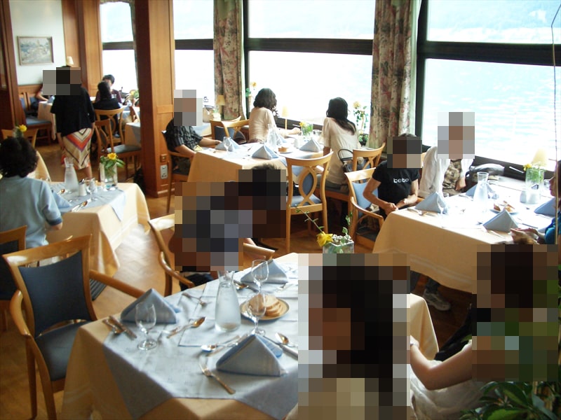 ホテルの湖側には常時30度の水温に保たれた湖面に突きだした湖水プールが自慢とのことで、レストランからもそのプールを含めた湖の景色が楽しめます。
