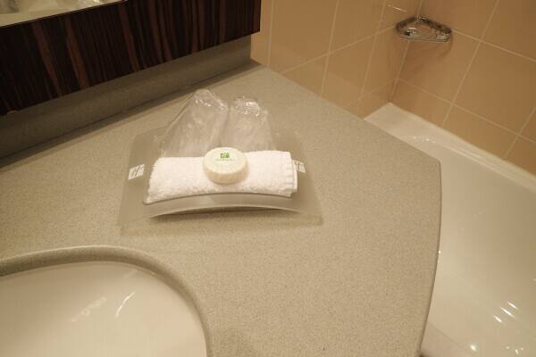 バスアメニティは固体の石鹸と、備え付けのシャンプーとボディソープだけでした。