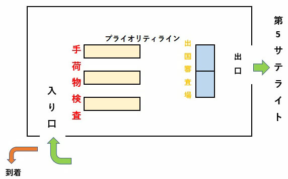 乗り継ぎ施設で出国審査を終えて出ますと第5サテライトとなります。