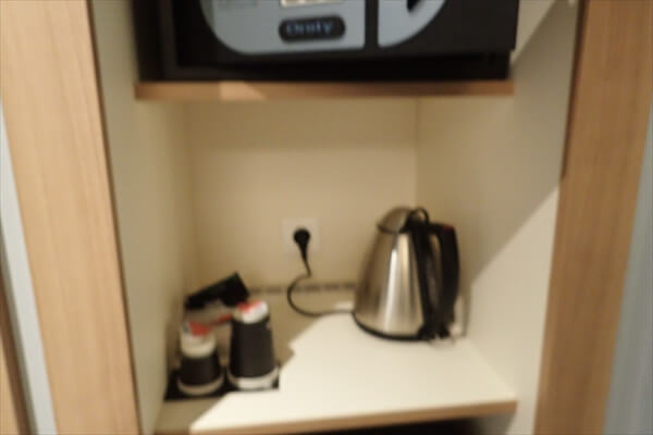 部屋には冷蔵庫もありコーヒーセットと共に湯沸かし器もあるのですが、水道水の硬水はカルシウムやマグネシウムを多く含んでいることから湯沸かし器の内側が白くなっていましたので使う気になりませんでした。