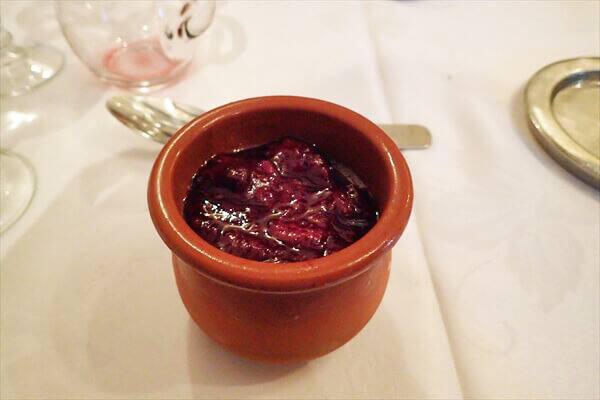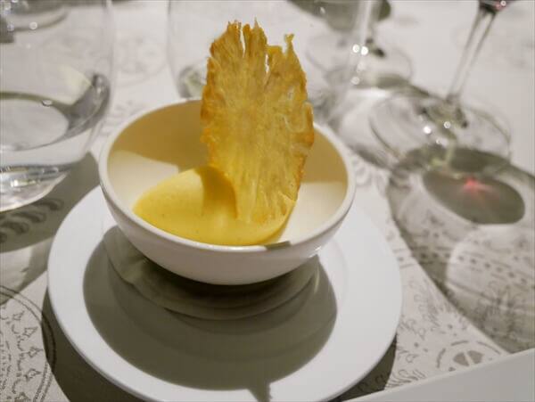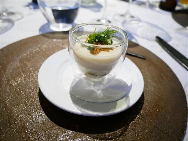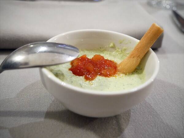 最初にいただいたガスパチョは少量ですが美味しくてワインには合いました。