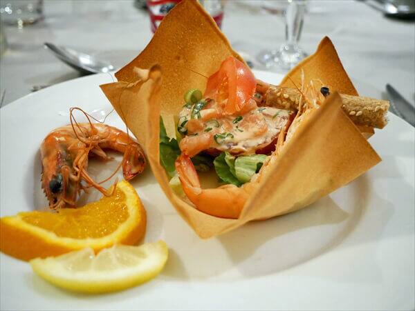 富豪で美食家のロートレックが好んだメニューとのことで、料理の内容はシュリンプサラダ、タラのバターソース、洋ナシのタルトとなっていました。