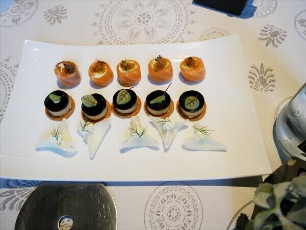 メニューは前菜でハニーがかかったヤギのチーズのブルスケッタのサラダ、メインはサーモンのバターソースです。