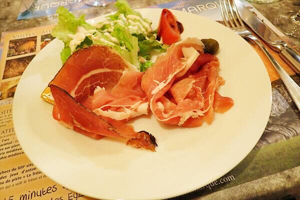 モンティニャックのレストランでのランチはスペインが近い場所ということもあってか、生ハムが美味しくてボリュームも満点でした。