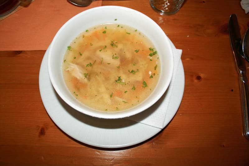 0,33L 細切り肉、根菜、フリッタータ・ヌードル入り濃厚チキン・スープ 115クローネ