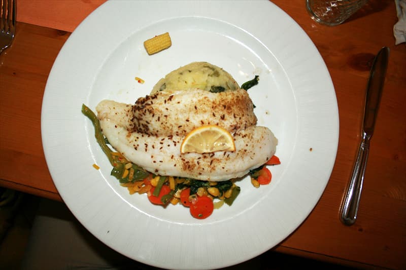 料理の内容はスープとパン、ポテトと茹でた野菜がのった魚料理にデザートとシンプルでしたが、レストランの雰囲気が良かったのでこれで十分な内容と思えました。