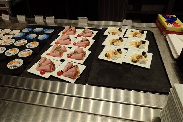 夕食はすでに空港内のレストランで済ませてありましたので、搭乗口に行くまでラウンジでシャンパンやワインを飲みながらつまむといった事をしようと思って行きましたが、やはり美味しそうなものは食べてしまいました。