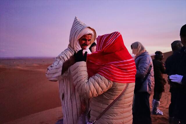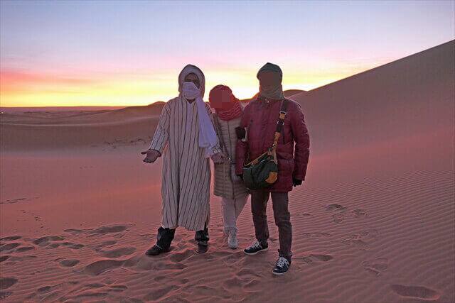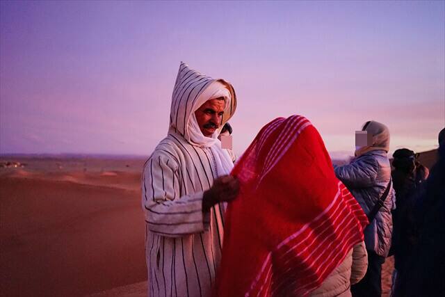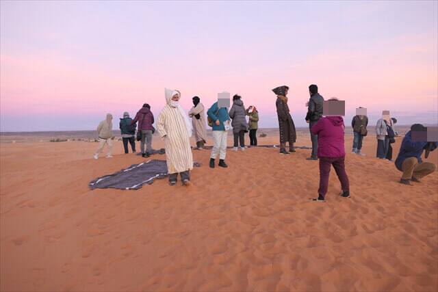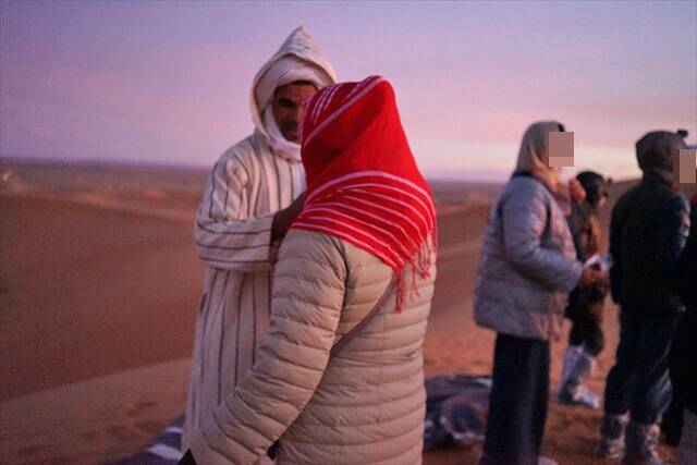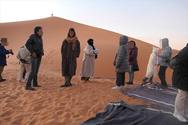 砂丘の丘の所で日の出を待ちますが、ベルベル人のスタッフは砂漠に座る様のシートを用意してくれます。