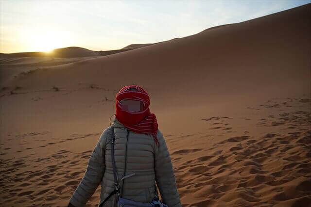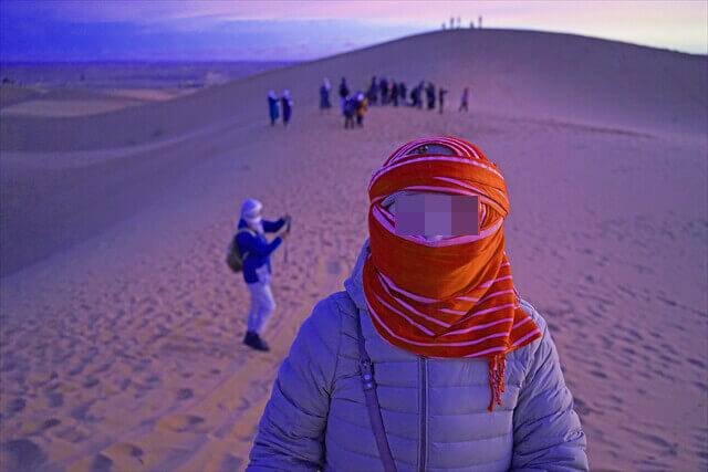 顔はフェズで寒さ対策のため購入したサボテンシルクのストールをベルベル人にターバンの様に上手に巻いてもらいました。