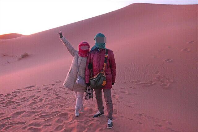 サハラ砂漠の砂丘に隣接するホテルのオーベルジュ カフェ ド スッドに宿泊した翌日の朝はラクダに乗って日の出を見にいきました。