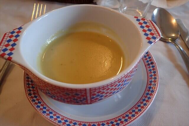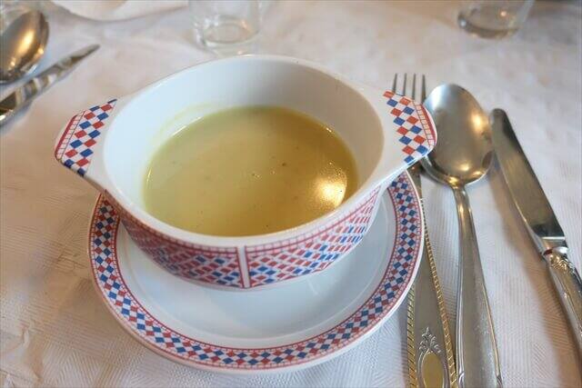 料理はまずはソラマメのスープでした。