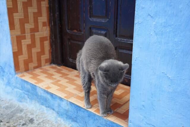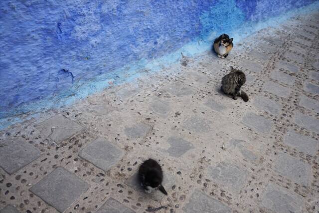 シャウエンにはいたるところに猫がいるのですが、野良猫ではなくエサがしっかり与えられていました。
