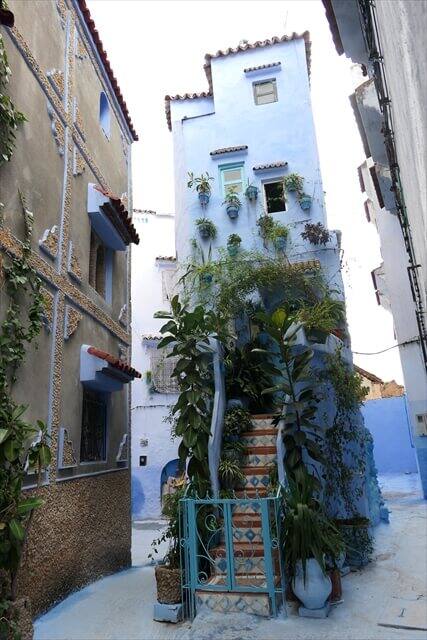 中を見ますと青い壁に花のハンギングが飾られてとてもシャウエンらしい様子にされていましたので、写真のバックの景色としてはとても良いと思いました。