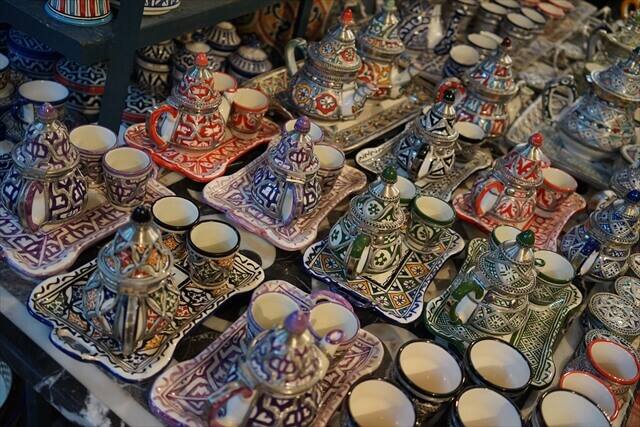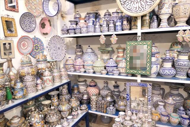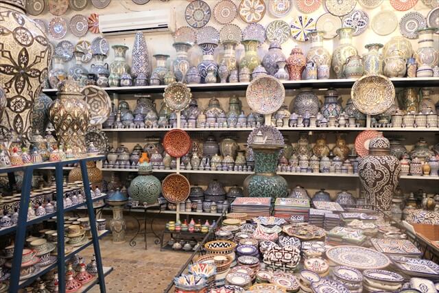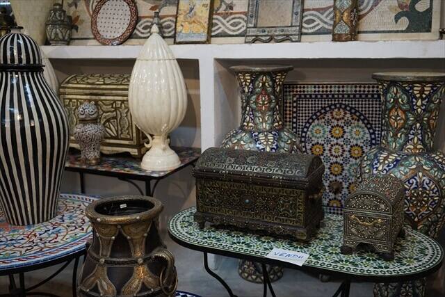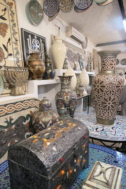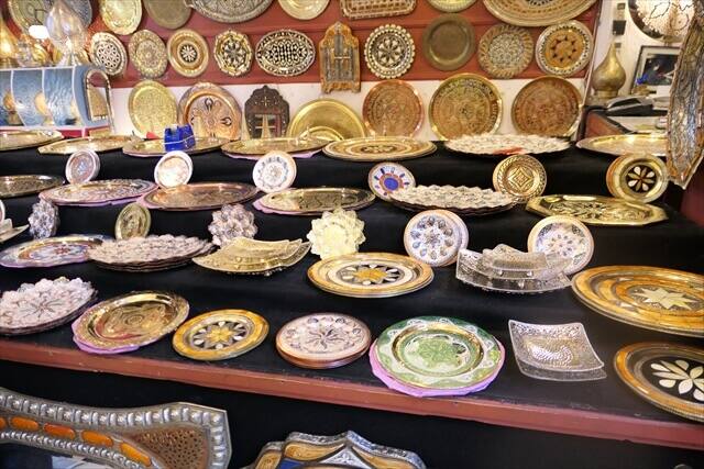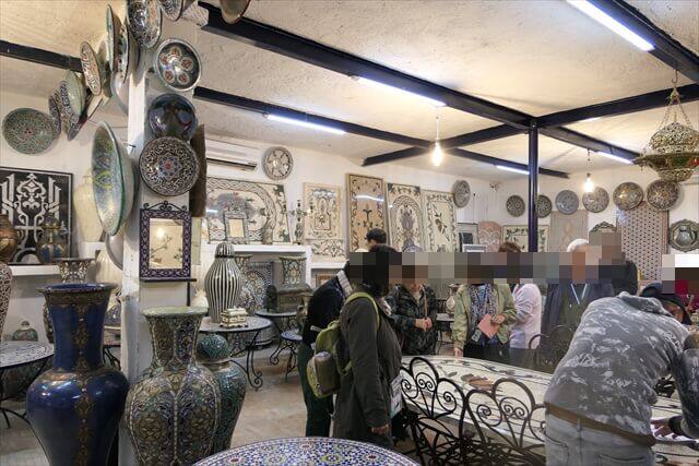 行ったお店はフェズ焼きとタイル細工のお店、銀食器や真鍮細工のお土産店、サボテンシルクを作って販売しているお店で、タンネリ見学の際にも最終的には皮製品のお店に連れていかれました。
