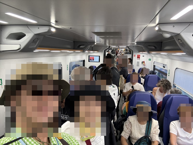 列車内はとても混んでいて通路も立っている人が多くとても暑いので大変でした。