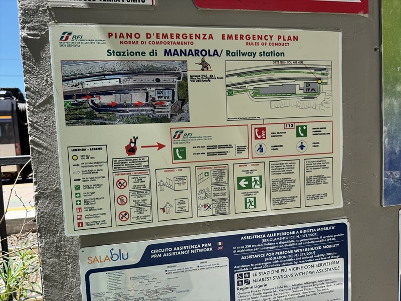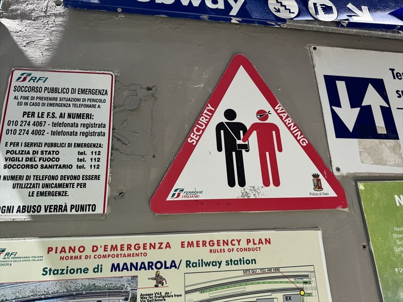 マナローナ駅は観光シーズンにはとても混むことからか、スリに注意という面白い表示がありましたし、駅員がスリに注意してねと駅で待っている乗客に言って周っていました。