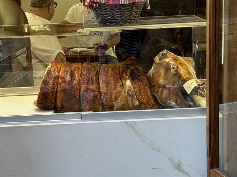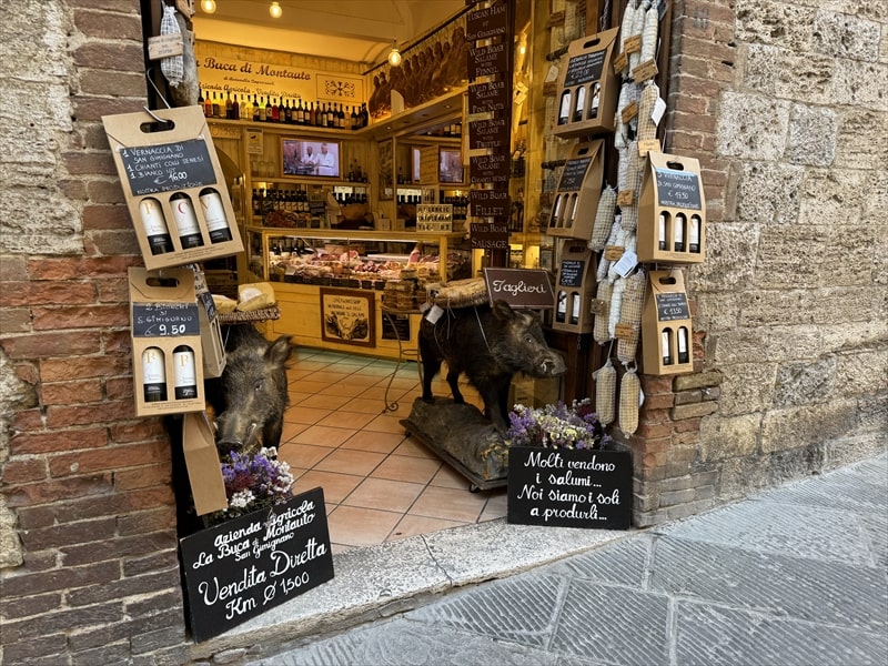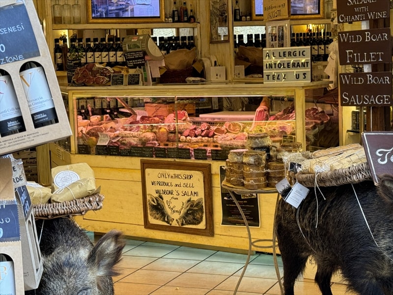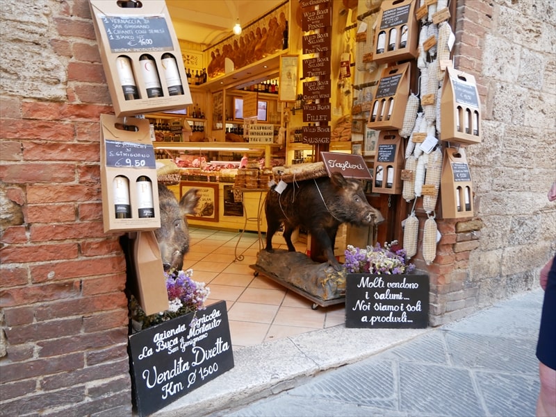 サン・ジミニャーノの名物はいのししのサラミですが、そのサラミを販売しているお店も何店かあり、いのししが居ました。