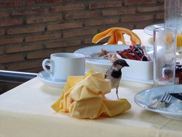 屋外席はスズメが食べ物を狙っていますので、席を離れますと食べられてしまうかもしれません。