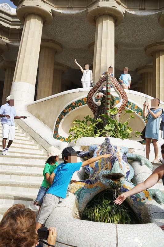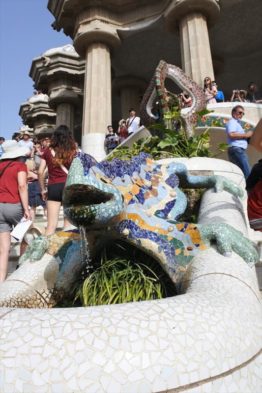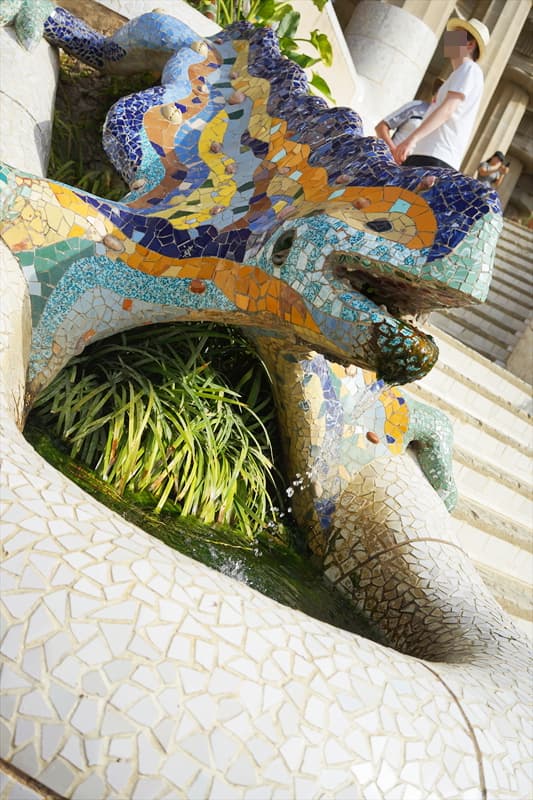 単なる装飾ではなく公園内の雨水排水システムの一部で、上部広場から流れた水がここから排出される設計となっているガウディらしい「美と機能の融合」です。