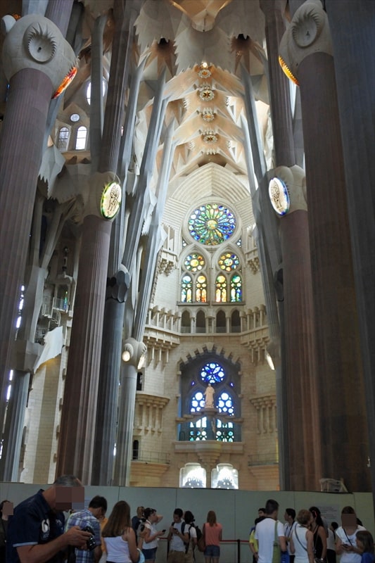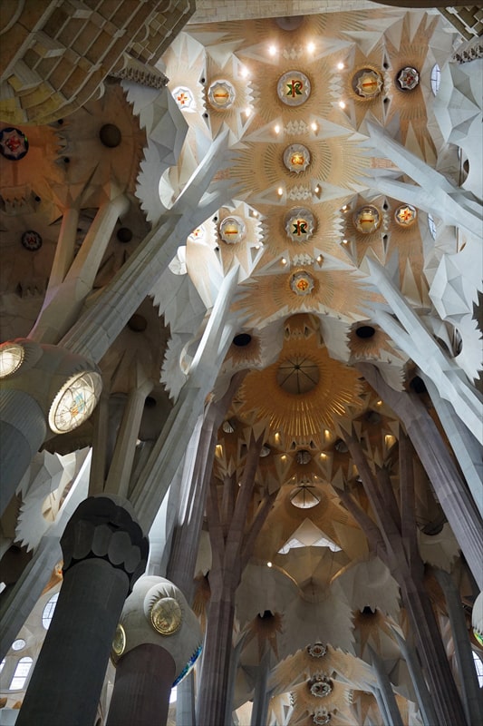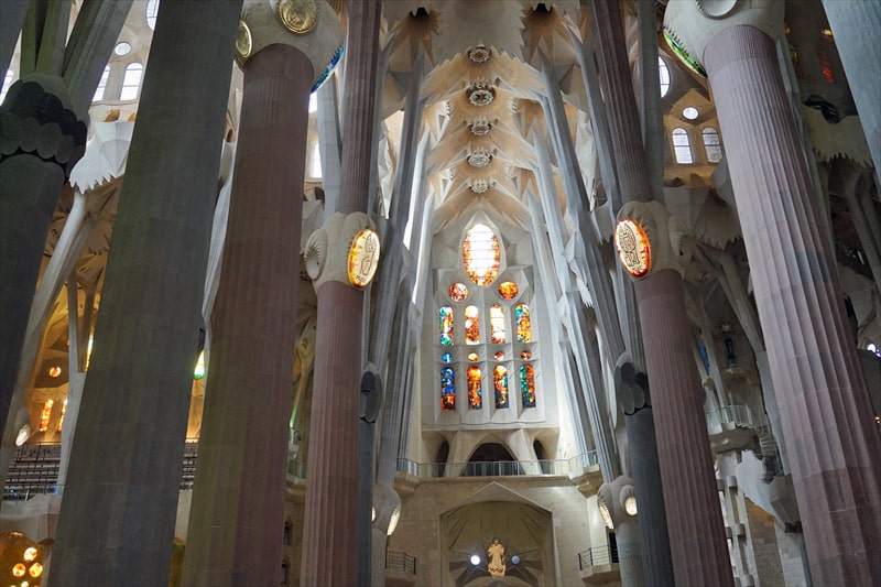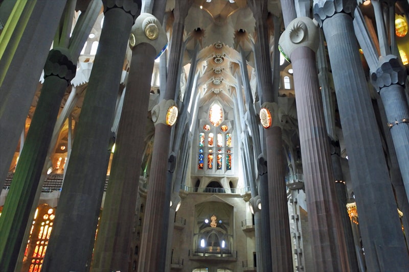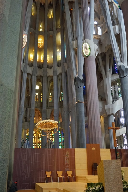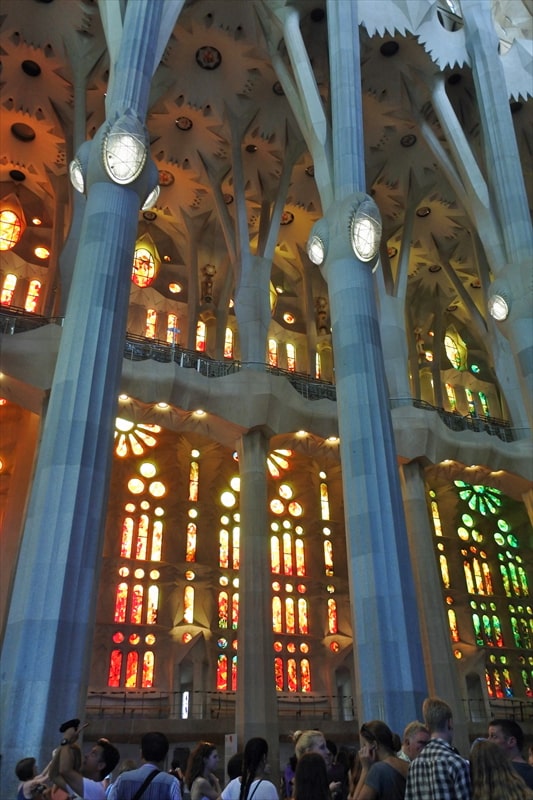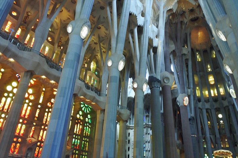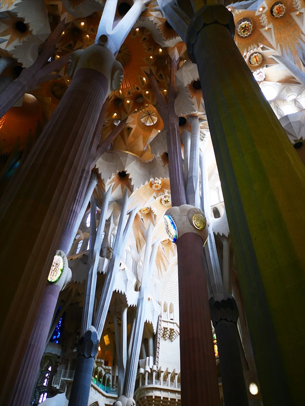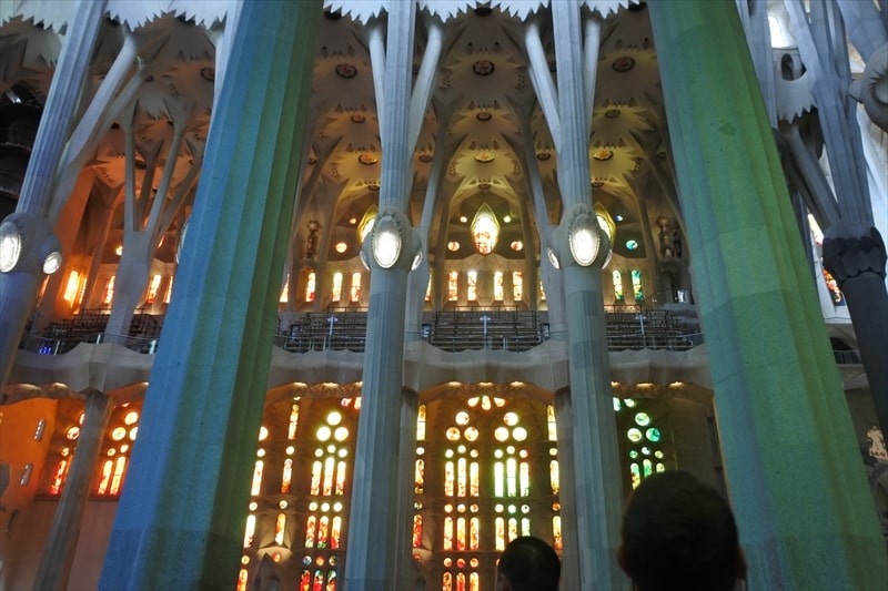 内部はガウディが1922年に作成した設計図案に基づいて建設されたもので、自然界の森を表現している事から木漏れ日の幻想的な光がとても印象的でした。
