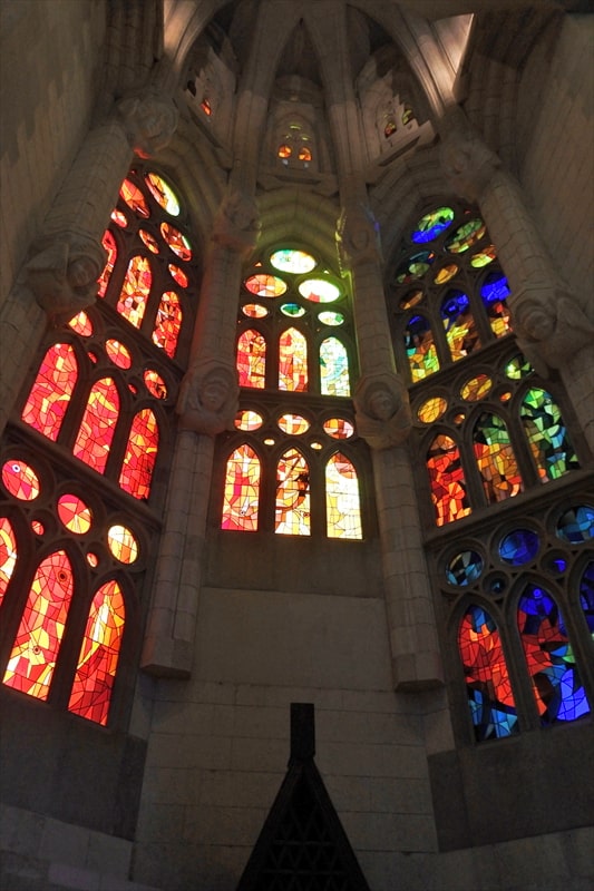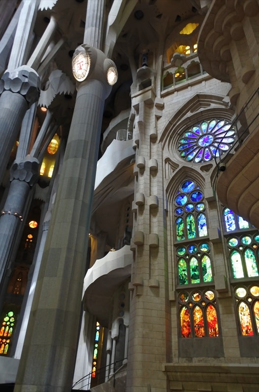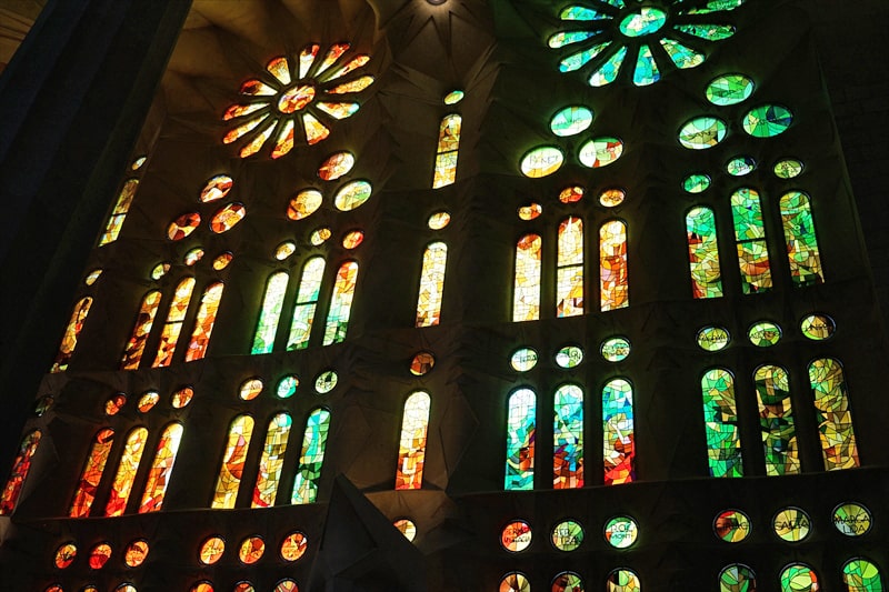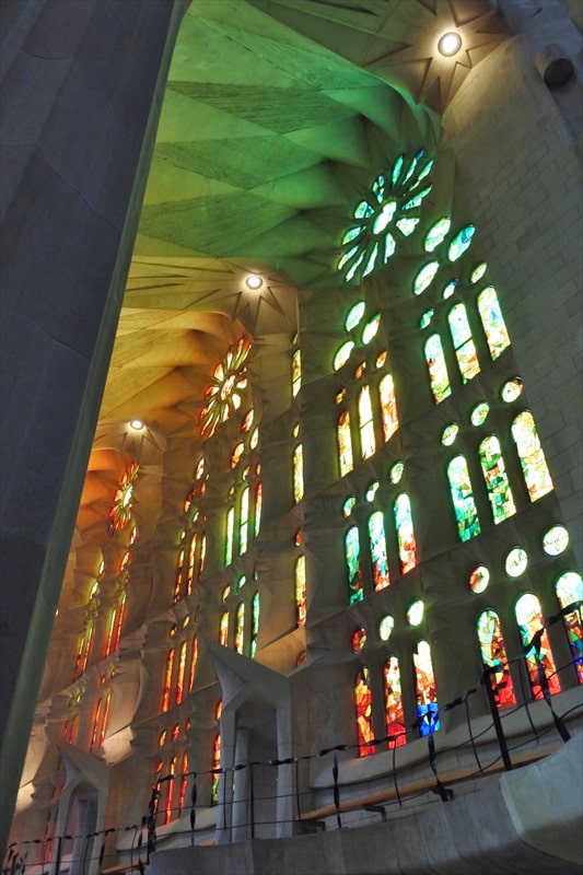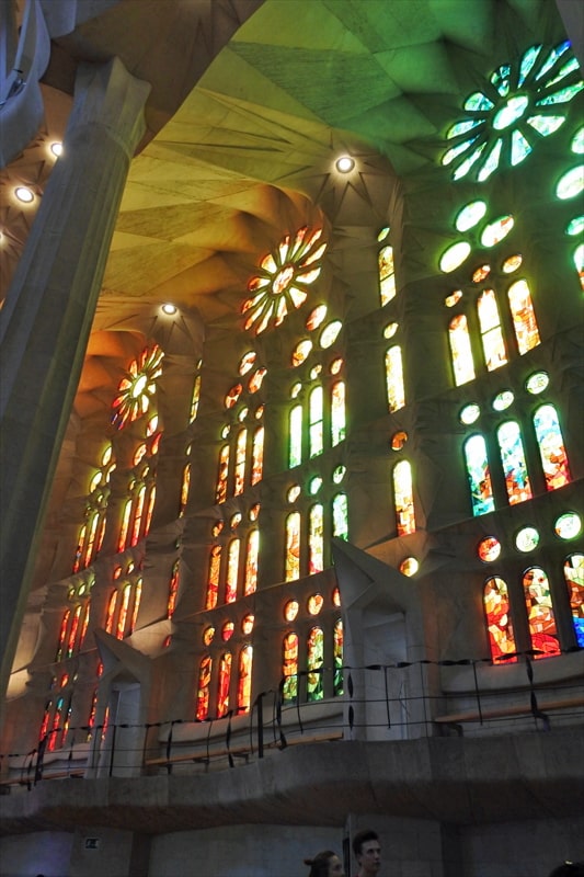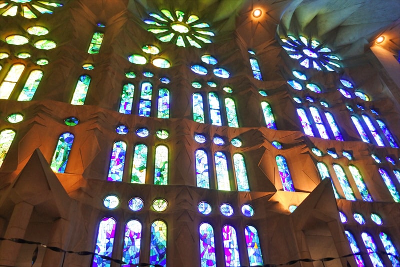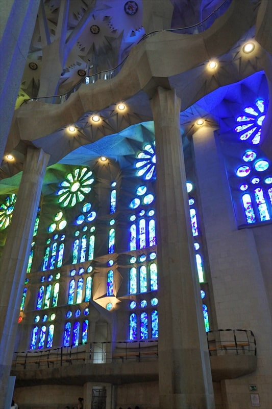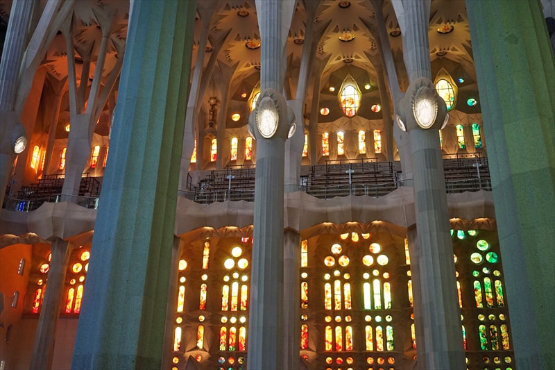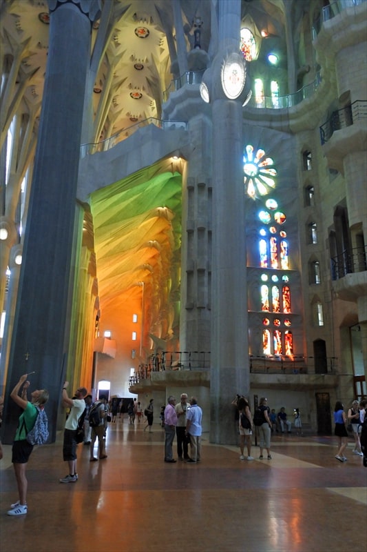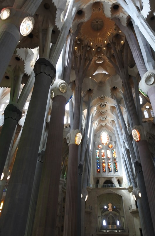 内部はガウディが1922年に作成した設計図案に基づいて建設されたもので、自然界の森を表現している事から木漏れ日の幻想的な光がとても印象的でした。