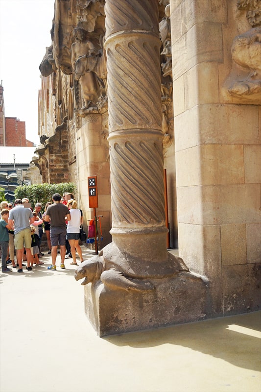柱の基部にはカメの彫刻が柱を支えていましたが、サグラダファミリアの彫刻で最初にこのカメの彫刻をガウディが手がけたとのことです。