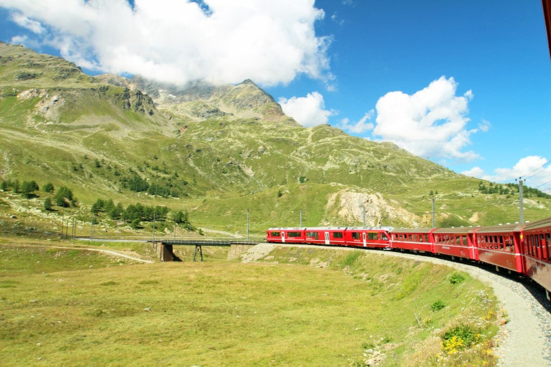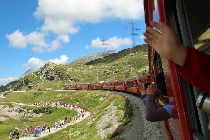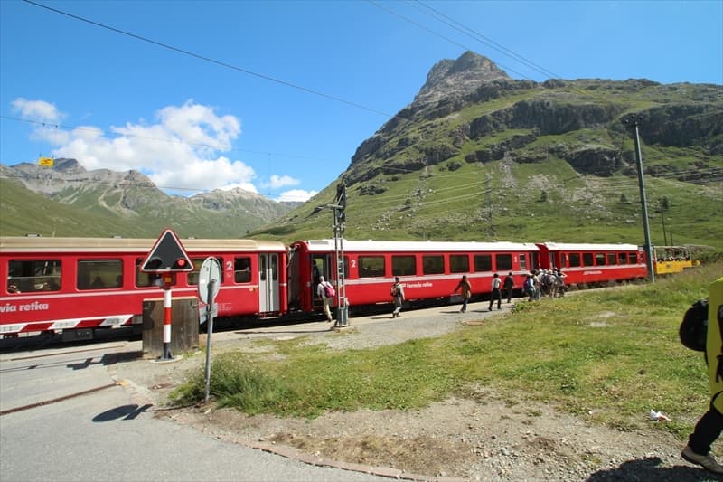 ベルニナ急行の車両は窓を開けることが出来ませんので、大きな車窓から景色を楽しむのですが、普通列車でしたら夏の天気の良い日の乗車では窓を開けることができるので爽やかな風を感じながら景色を楽しめますので個人的には普通車がおすすめです。