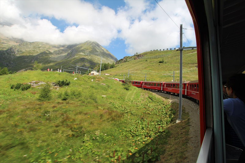 ベルニナ線は標高約429 mのティラノ駅から標高2253 mのベルニナ峠まで登りながら、標高差約1800 m を走る「世界で最も高い粘着式鉄道」 で、途中の景観が圧巻で列車の旅そのものがすばらしいのです。