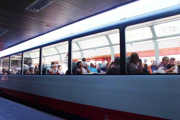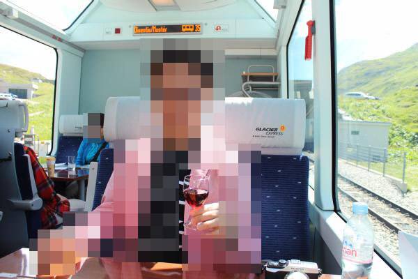 私たちが昼食後のアンデルマット駅で乗車する氷河特急の車両を待っている時に昼食時間ということもあり、氷河特急内で食事を楽しみながら乗車している方が乗った車両が通過しました。